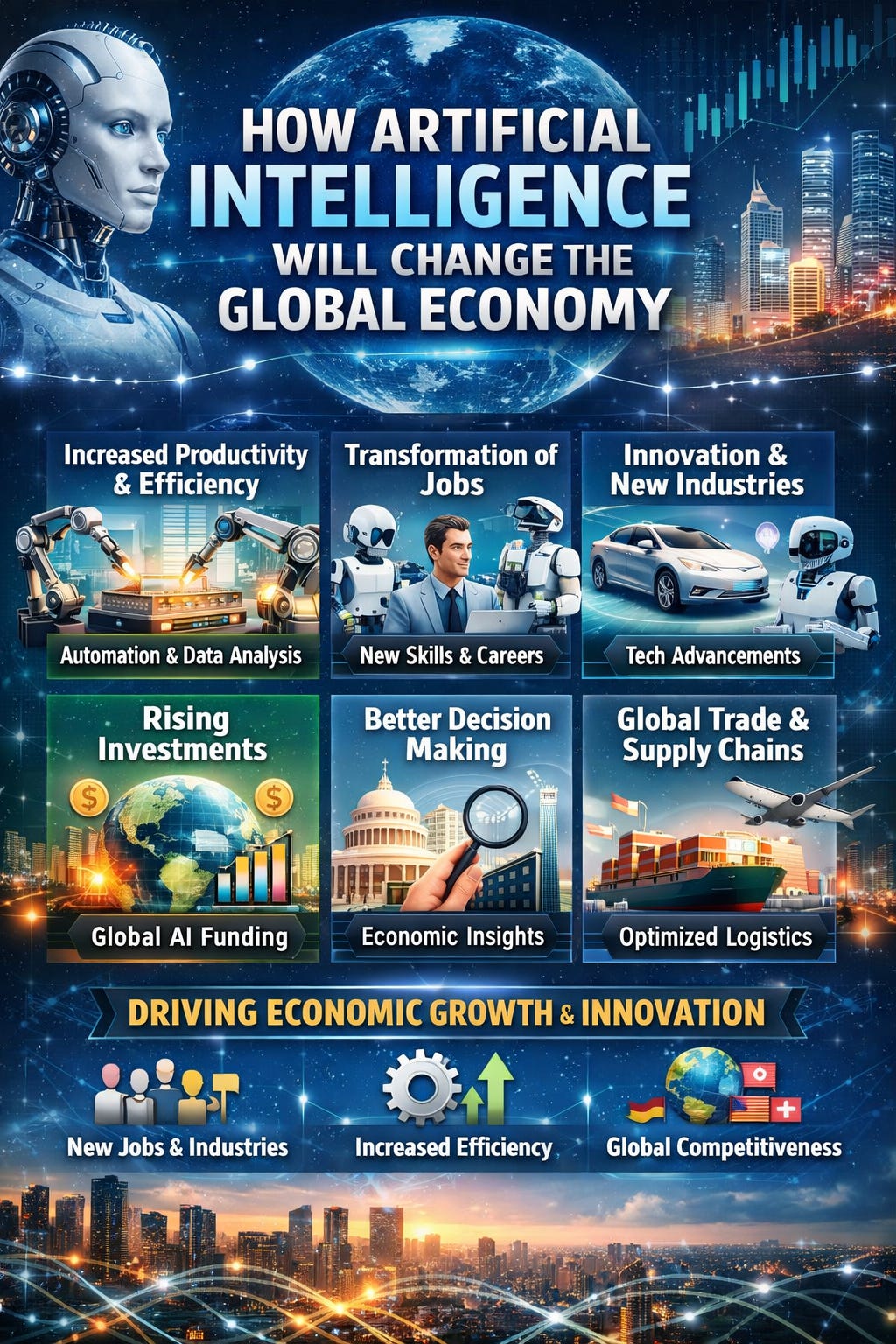 Artificial Intelligence (AI) is rapidly transforming the global economy by improving productivity, enabling innovation, and reshaping industries. AI technologies allow businesses and governments to analyze large volumes of data, automate complex tasks, and make faster, more accurate decisions. This transformation is creating new economic opportunities while also changing the nature of work and investment. As an AI adoption continues to grow, it is expected to significantly contribute to global economic growth, improve operational efficiency, and create new industries. This article explores how AI is influencing the global economy, its impact on businesses and jobs, and the potential future economic outcomes driven by AI innovation.